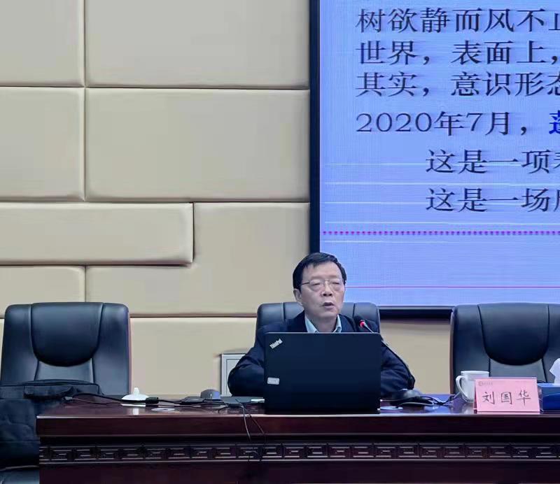 刘国华从意识形态领域错综复杂的种种表现及需要高度警惕的几种错误思潮出发,结合当下国内国际局势和高校意识形态工作实际,准确研判了当前意识形态领域的整体斗争态势。刘国华指出,高校要打好意识形态领域的阵地战,必须坚持马克思主义指导地位,牢牢把握意识形态领导权;要积极弘扬社会主义核心价值观、唱响主旋律;要传承中华优秀传统文化,树立自信心;要强化抵制错误思潮的责任感、增强敏锐性;要加强网络建设和监管工作,掌控话语权;要把思想政治教育工作贯穿于教育教学全过程,增强工作的实效性。