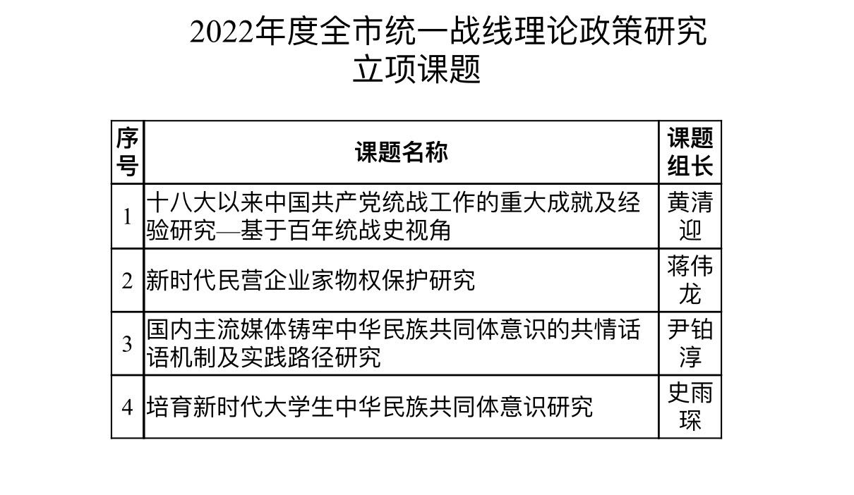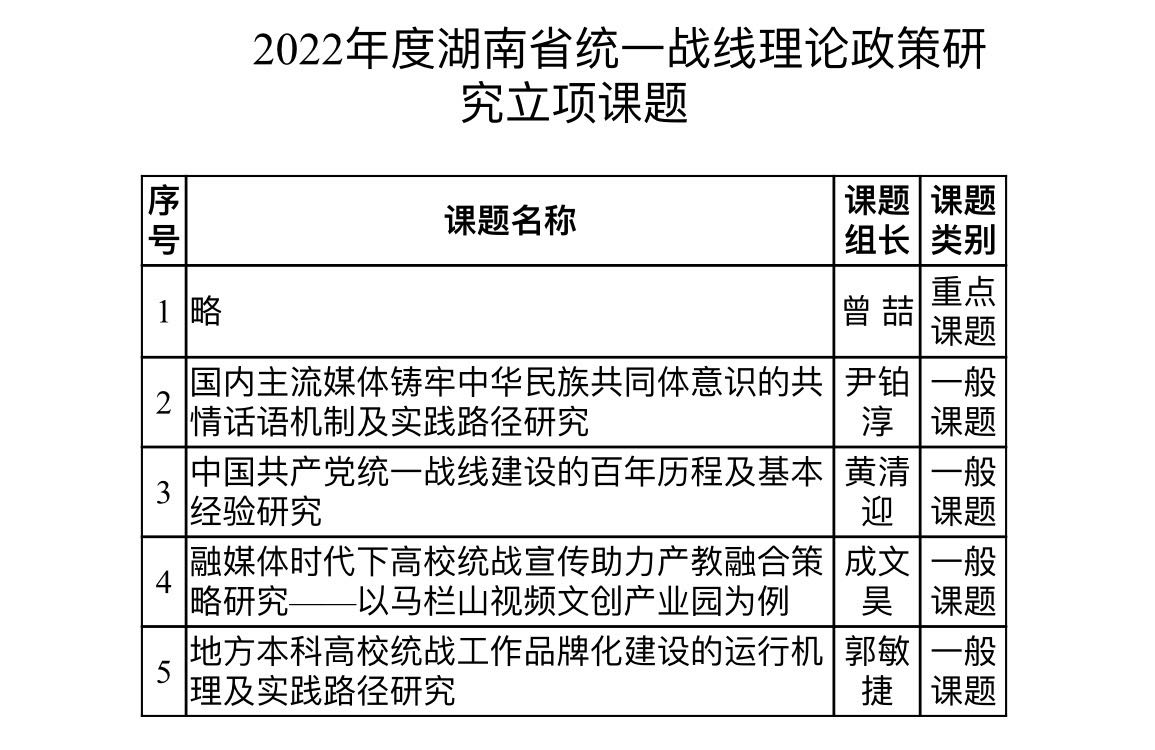 近日,湖南省委统战部、长沙市委统战部相继下发通知,公布了2022年度统一战线理论研究立项课题名单。我校5项课题获省级立项,其中重点项目1项、一般项目4项;4项课题获市级立项。