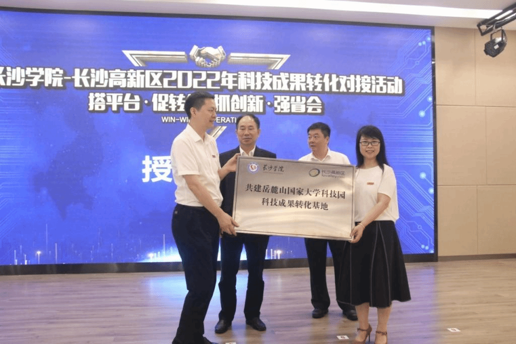 对接会上,长沙学院和长沙高新区领导共同为“长沙学院-长沙高新区共建岳麓山国家大学科技园科技成果转化基地”授牌,我校相关二级学院代表与园区企业共同为“长沙学院-中科助英智能科技研究院先进视觉联合实验室”“长沙学院-中合慧景 乡村振兴与数字文旅产学研基地”“长沙学院-锦绣潇湘文化创意产业园产学研合作平台”“京东物流-长沙学院智慧供应链研究基地”等四个平台揭牌。