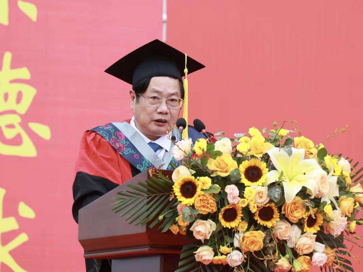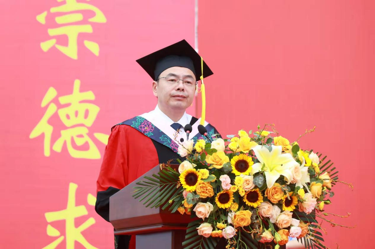 典礼在雄壮的国歌声中拉开帷幕。党委副书记、校长黄立宏在致辞中代表学校向毕业生送上美好祝愿。“孟夏草木长”,在这充满生机活力的季节,黄立宏勉励广大毕业生胸怀远大、勇毅前行,在未来的人生道路上不断完善自我,希望毕业生自信地走向人生的新阶段,坚持弘扬“崇德求真,实干担当”的长大精神,用脚步丈量祖国大地,用眼睛发现中国精神,用耳朵倾听人民呼声,用内心感应时代脉搏,把个人梦、家庭梦和国家梦、民族梦结合起来,把自己的事业、自己的奋斗和服务国家、服务社会、服务人民结合起来,努力成为中华民族伟大复兴中国梦的建设者、推动者和圆梦者,在新征程中书写更精彩的人生华章。