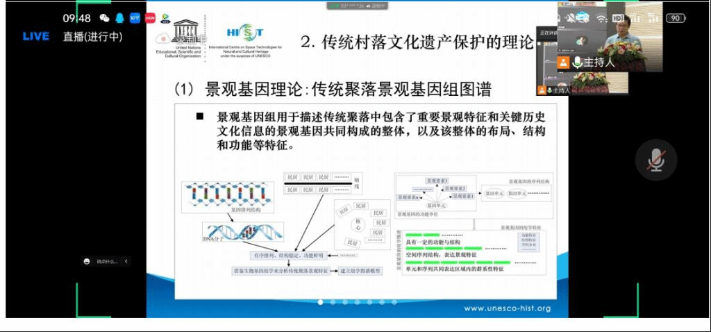 数字遗产云课堂共有5个报告,由HIST副主任付碧宏研究员和HIST研究四部部长王成研究员共同主持。HIST副主任、中国科学院空天信息创新研究院陈富龙研究员作了题为“遥感视角下的文化遗产”的报告,他从遥感角度出发,阐述了遥感技术对文化遗产保护与监测的意义,同时提出全新立体考古技术集成的畅想。中国地理学会常务理事,HIST长沙工作站主任刘沛林教授作了“传统村落文化遗产数字化与虚拟旅游”的报告,他在系统阐述原创的景观基因理论基础上,分享了传统村落文化遗产数字化保护实践案例及其网络虚拟旅游发展前景;中国科学院地理科学与资源研究所研究员、自然与文化遗产研究中心副主任闵庆文就“农业文化遗产数字化保护”的相关问题作了报告,他阐述了运用信息科学原理、方法和技术实现农业文化遗产的保存与合理开发。同济大学韩锋教授围绕“风景遗产与文化景观数字化创新保护研究与实践”作了精彩报告,他提出将文化遗产保护与数字化相结合,实现信息技术与文化遗产保护同频共振;中山大学旅游学院教授孙九霞作了题为“以遗产的旅游化与旅游的遗产化”的报告,集中阐述了旅游发展与遗产保护的双向融合。