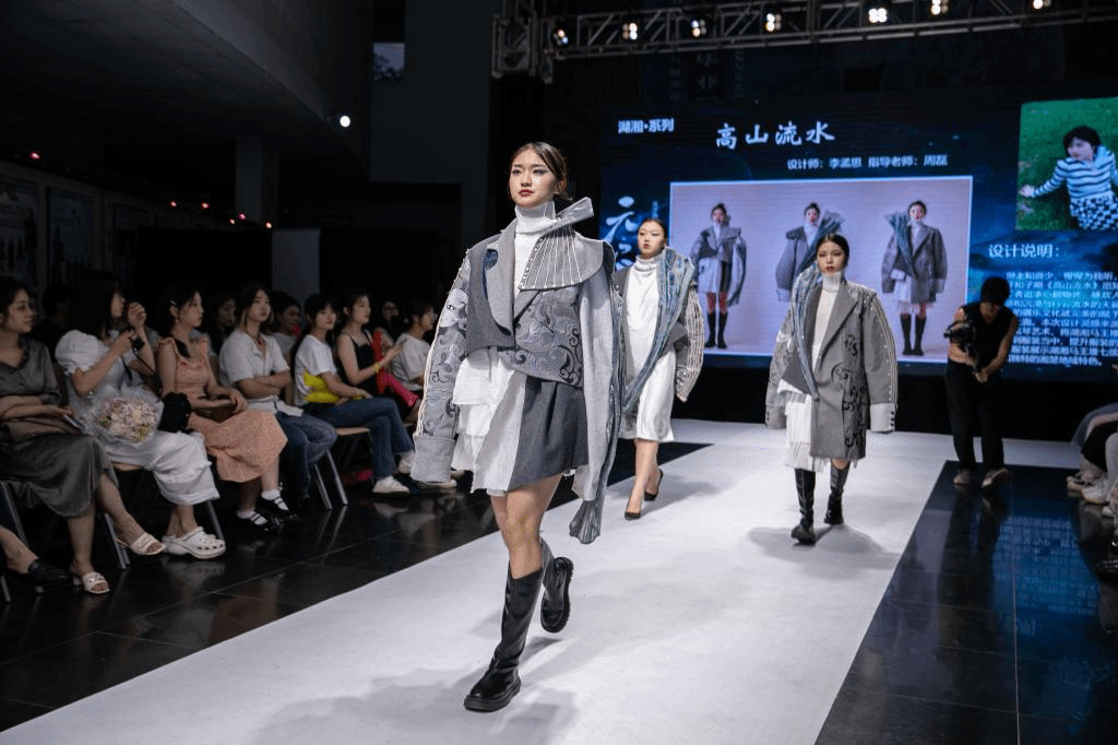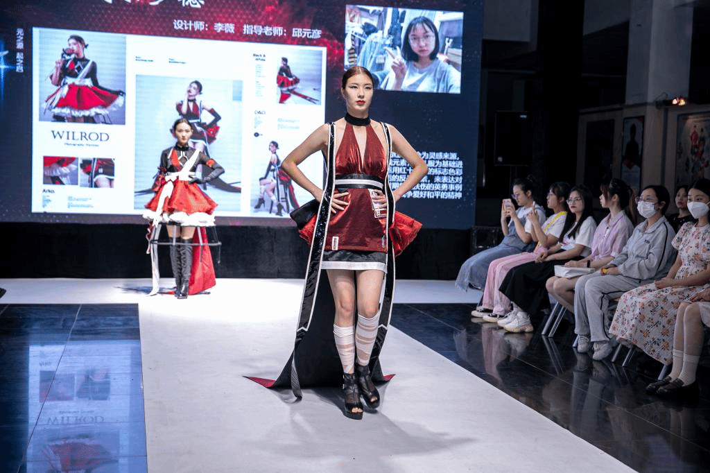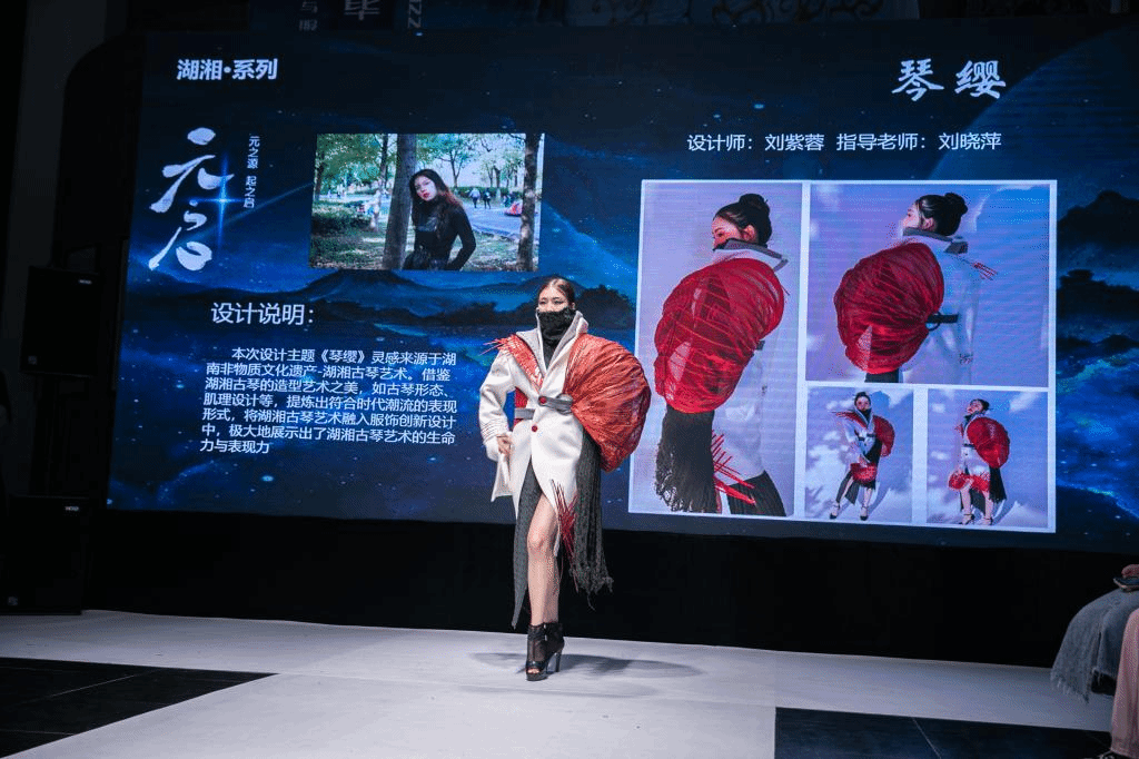 因为疫情防控对参与人数限制要求,故今年的毕业设计展演是一场小而精美的交流会,它重点诠释主题服饰的湖湘地域文化特色,如:湘江古镇群、马王堆七弦琴、湘绣等经典元素。毕业设计作品展演主要分为五个系列:红色文化系列、湖湘文化系列、国风系列、民族系列、现代与未来系列。作品展现了同学们创新性地使用设计语言对传统文化与服饰设计进行结合的思考,服装设计以弘扬传统文化为基调,体现了同学们的审美素养和人文情怀,为现场观众带来了一场视觉盛宴。