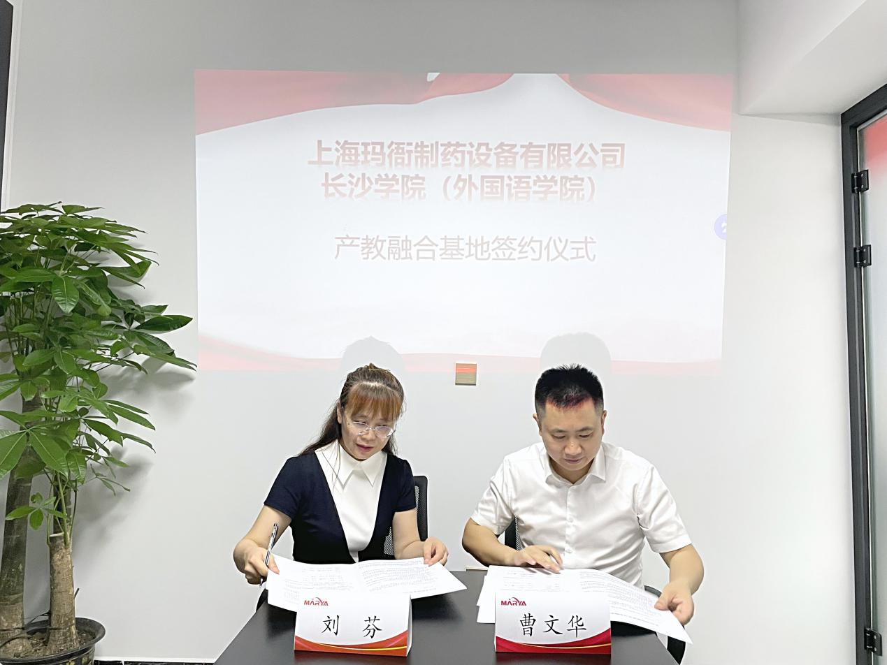 上海玛衙制药设备有限公司由外国语学院2011届毕业生曹文华创办,曹文华介绍了公司的企业文化、主营领域、发展愿景等,回顾了自己在长沙学院的求学经历,并表达了对母校的感恩之心,表示要在母校设立励志奖学金,帮助有困难的优秀学弟学妹。胡石明指出,学校的高质量发展离不开校友的支持,希望公司能多录用、多培养我校毕业生,今后进一步与学校在协同育人、产教融合等方面加强合作。外国语学院与上海玛衙制药设备有限公司还举行了产教融合基地建设签约仪式。