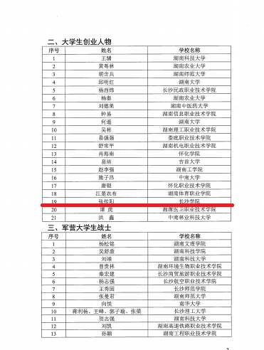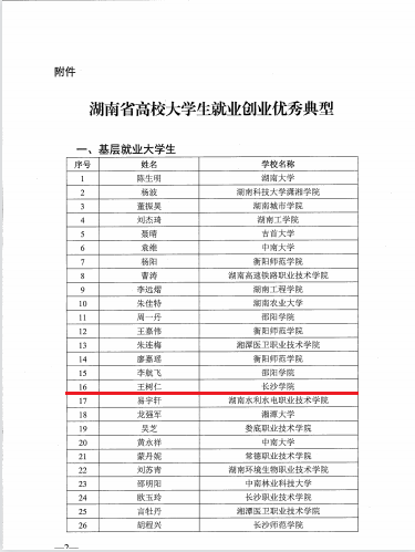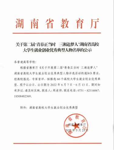 由省教育厅主办、省大中专学校学生信息咨询与就业指导中心组织的第二届“青春正当时 三湘追梦人”湖南省高校大学生就业创业优秀典型人物评选已结束。全省共87所高校推荐235名优秀毕业生参加此次评选活动,经省教育厅组织专家盲审,最终评选出60名湖南省大学生就业创业典型人物。我校推荐的王树仁同学入选基层就业大学生,张传阳同学入选大学生创业人物。
