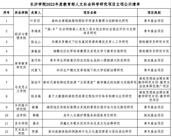 2022年,我校教育部人文社会科学研究项目申报共计46项,立项12项。从校内各单位立项情况来看,共有7个学院(研究院所)获得立项,乡村振兴研究院、音乐学院均实现了该类项目在其所在单位的首次立项,其中乡村振兴研究院作为全校性科研平台,一直高度重视跨学院、跨学科组建团队,紧密对接马栏山视频文创产业园研究需求,开展基于文化与科技融合的“数字文旅与创意经济”研究,本次立项的《南岭走廊瑶族服饰图纹字符谱系整理与创新转化研究》《面向旅游体验的侗族碎片化文化基因修复与显性表达研究》《湘西地区传统村落理水系统的景观价值评估与优化路径研究》《湘赣边区红军标语整理及其党史学习教育价值研究》《共建共享模式下红色基因资源库建设及育人工作研究》等项目,都是依托该平台围绕“文化内容挖掘”开展的研究,也是瞄准地方经济社会需求,推动创新链、产业链、学科链、人才链深度融合的有益探索。此次我校教育部人文社会科学研究项目立项数实现历史性突破,是在学校党委、行政的领导下,全校教师与职能部门共同努力的结果,也是学校人文社会科学研究整体实力正不断增强的集中体现。