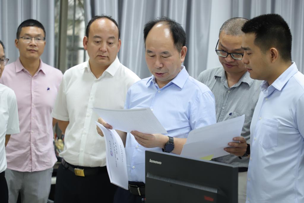 党委副书记、校长黄立宏,党委委员、副校长曾广胜在中控室查阅资料
