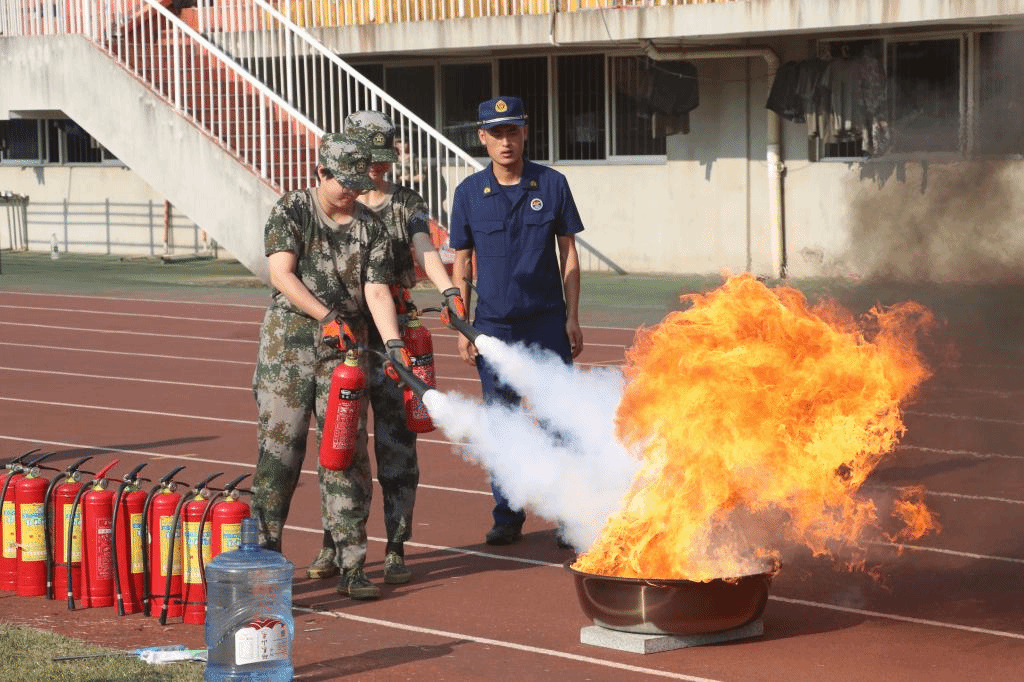 (同学们现场体验使用灭火器灭火)