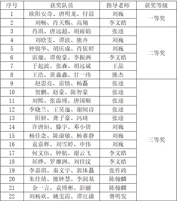近日,由湖南省教育厅主办的2022年湖南省大学生数学建模竞赛暨全国大学生数学建模竞赛湖南赛区的比赛结果揭晓,全省共有61所普通高校的1519个代表队参加了此次比赛,我校学子在本次大赛中获得湖南省一等奖2项,二等奖6项,三等奖14项的好成绩。