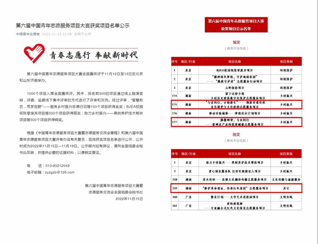 第六届中国青年志愿服务项目大赛是由共青团中央、中央文明办、民政部、水利部、文化和旅游部、国家卫生健康委员会、中国残疾人联合会、中共山东省委、山东省人民政府主办的志愿服务领域级别最高、参与最广、影响最大的活动,参评项目涉及全社会各行业、各领域的志愿服务工作,涵盖文明实践、环境保护、关爱少年儿童、为老服务、阳光助残、卫生健康、应急救援、文化传播与旅游服务、法律服务与普法和其他等13个大类。自大赛举办以来,校团委精心组织校内志愿服务项目参加比赛,经层层筛选、线上路演答辩、专家集中评审等环节的激烈角逐,在省赛中斩获四金三银,金奖数与中南大学并列省内第一。在全国赛终评中,我校“与音同行,古韵新生——侗族非遗传承湖南音乐课堂与文化扶持”和“播撒硒望,与农同行——富硒农产品的提质赋能”两个志愿服务项目获得银奖;“修护革命遗址,传承红色基因”志愿服务项目获得铜奖。