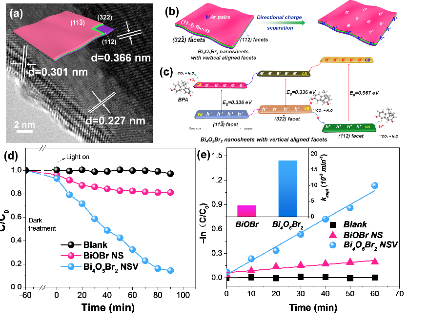 利用Bi4O5Br2不同晶面键结形成垂直晶面同质结构,通过不同晶面的能带结构排列与弯曲促进载流子定向迁移与有效分离,提高可见光催化降解BPA的活性与矿化能力。(Appl. Catal. B: Environ., 2021, 286, 119937.)