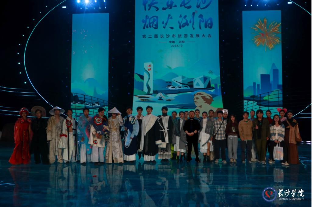 据了解,本次旅发大会邀请艺术设计学院参与“星城潮涌”项目,晚会屏幕上展示的25套国潮服装为我校2022届服装与服饰设计专业学生的设计作品。