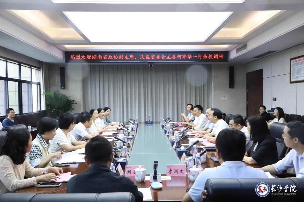 6月27日上午,湖南省政协副主席、民盟省委会主委何寄华一行来学校调研,民盟省委会组织处处长钟为恒,民盟市委会副主委、长沙市工业和信息化局副局长张芬等参加调研。党委书记杨小云、校长陈赤平等在校校领导陪同调研。