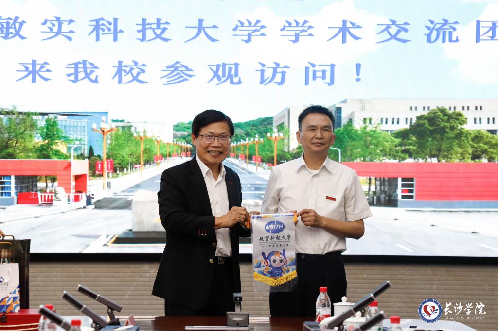 台湾敏实科技大学副校长陈建中、周惠珍教授、赖东佑教授、总务长锺美惠等教职人员,长沙市台办对台交流处蒋竹青,学校党政办、组织统战部、宣传部、教务处、科技处、国际合作与交流处、相关二级学院主要负责人参加交流座谈。