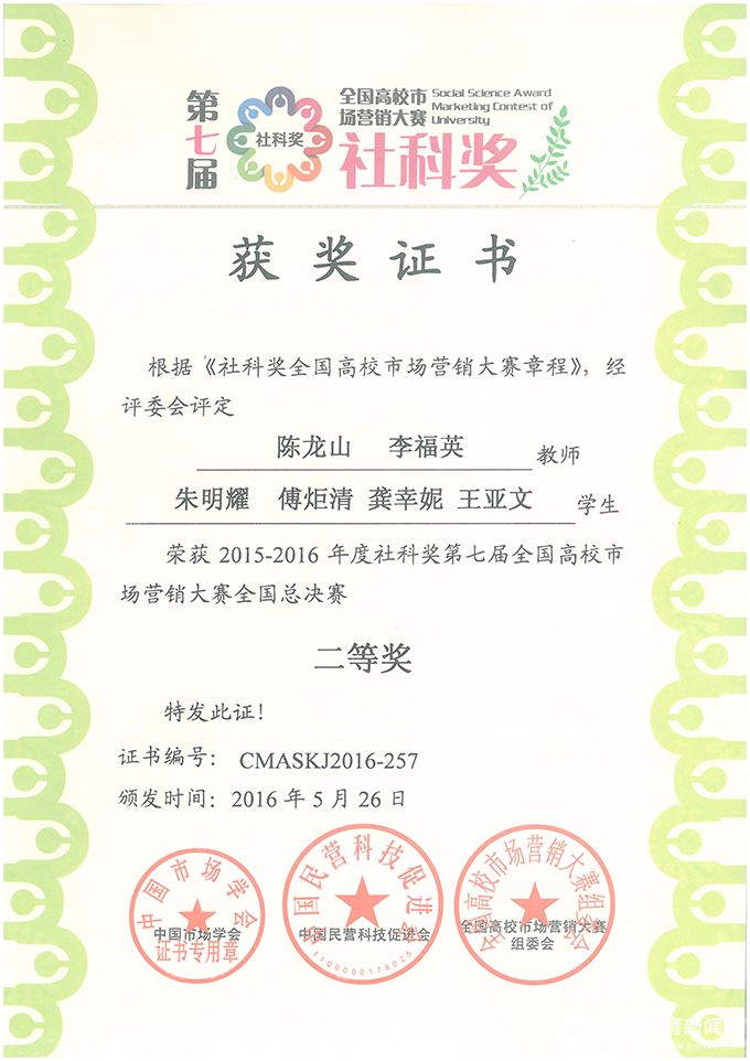 5月26日,第七届“社科杯”全国高校市场营销大赛总决赛在梅地亚国际会议中心成功举办。全国共有500多所院校、1400多个团队参赛;最终进入总决赛的有120个团队。长沙学院ATP团队(傅炬清、朱明耀、王亚文、龚幸妮)历经八个月的努力,在本届大赛中获全国复赛一等奖,决赛二等奖,最佳创意团队奖等。
