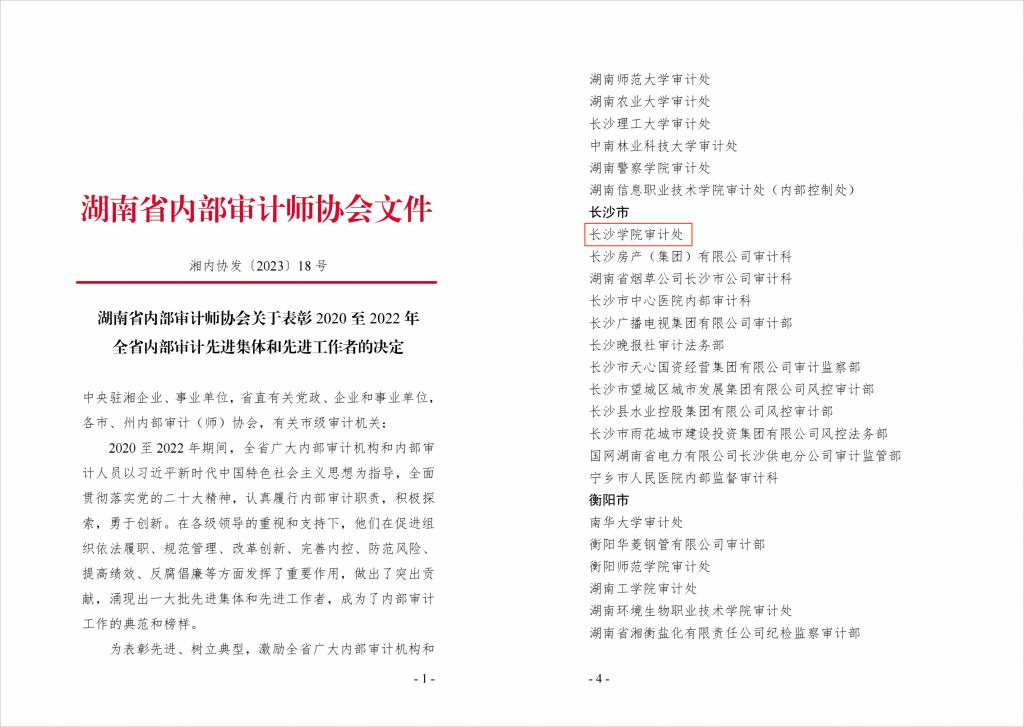 12月8日,湖南省内部审计师协会下发了关于表彰2020 至2022年全省内部审计先进集体和先进工作者的决定,我校审计处首次获得全省内部审计先进集体荣誉称号。