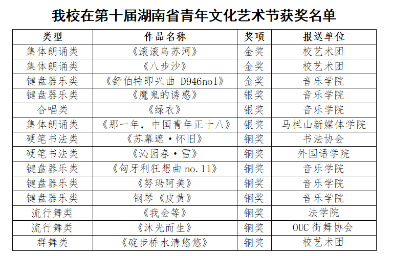 近日,第十届湖南省青年文化艺术节比赛结果正式揭晓,我校共有14项作品获奖:其中金奖3项、银奖3项、铜奖8项;另有4位教师获“优秀指导老师”称号,学校获“优秀组织奖”。