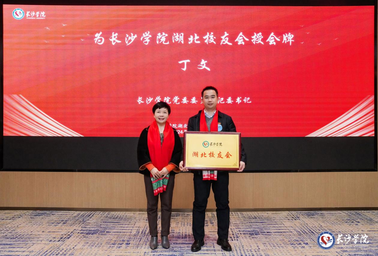 (党委委员、纪委书记丁文为长沙学院湖北校友会授会牌)