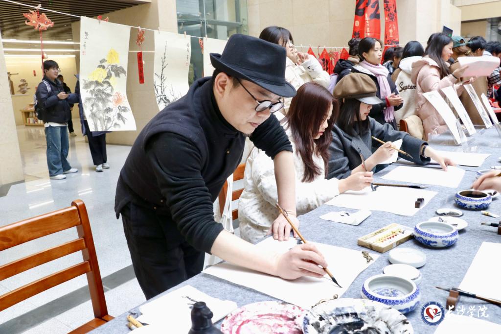 龙狮协会两支灵动的祥狮在激昂的鼓乐声中用灵动矫健的身姿,舞出新春的欢腾与活力,也为活动拉开了序幕。省内书画名家王元建、陈炼、柳玉、张建龙四位教授及黄慧瑾、朱洁华、卿旭峰等老师受邀前来,现场挥毫泼墨,用春联和画扇把美好的祝福送给现场师生。活动当天还吸引了多位留学生参与,近五百位师生现场品味煮茶雅趣,体验书画墨蕴,镌刻剪纸意趣,参与投壶竞技,展示汉服之美,共同感受着浓浓的“中国味”。