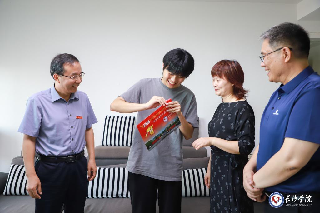 2025“恭喜你被长沙学院录取!”7月4日上午,校长陈赤平携党政办、研究生学院、马栏山新媒体学院负责人来到长沙市雨花区湘水一城小区,将学校首封硕士研究生录取通知书送到新生李宁康手中。陈赤平在送上录取通知书的同时向李宁康及家长表示祝贺,对他们选择长沙学院表示感谢,并送上了长沙学院文创礼盒和校徽。陈赤平表示...
