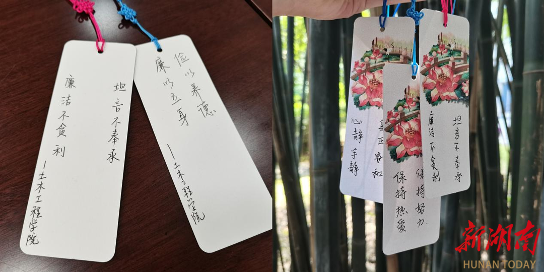 在国际交流处处长青锋的办公桌上摆放着一张家人写的卡片——“希望你坚守道德底线,忠诚履职,廉洁奉公,堂堂正正做人,清清白白做事,不辜负家人的期盼,不辜负全校师生的信任,不辜负党和国家的培养。”在长沙学院,每位中层正职干部都有一份“清廉传家寄语”展台,寄语有夫妻之间的理解和提醒,有长辈对晚辈的嘱托和叮咛,也有孩子对爸爸妈妈的崇敬和祝福,他们用情真意切的文字将“廉洁清风”吹进家庭。